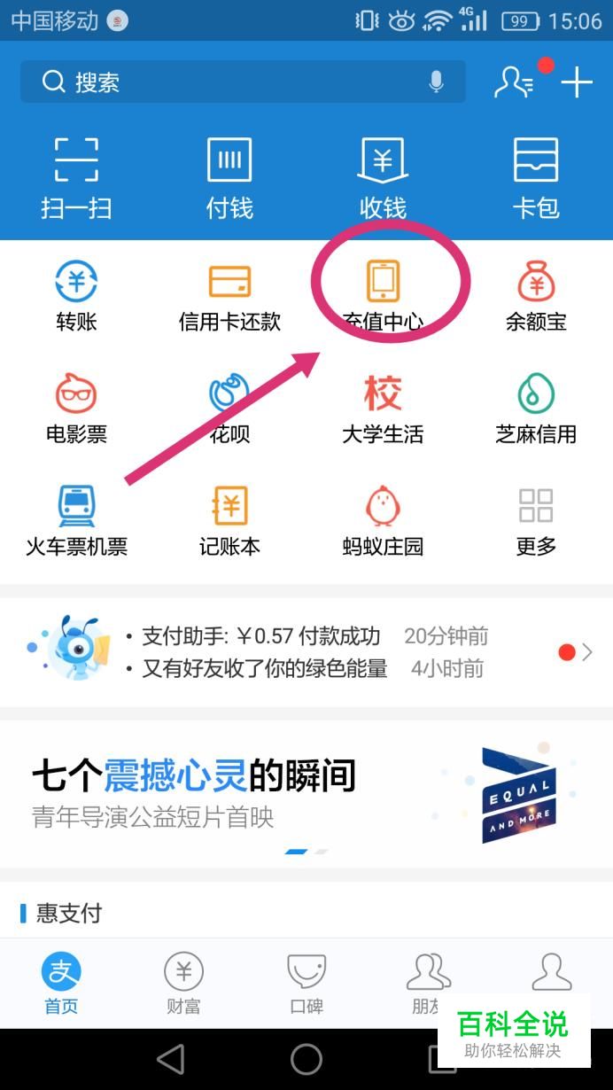 登录进入支付宝app后,点击“充值中心”。如图所示。