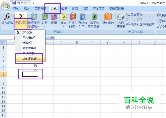 然后我们选择22下方的单元格,然后点击工具栏中的公式,然后点击自动求和的下拉箭头,然后点击其他函数;