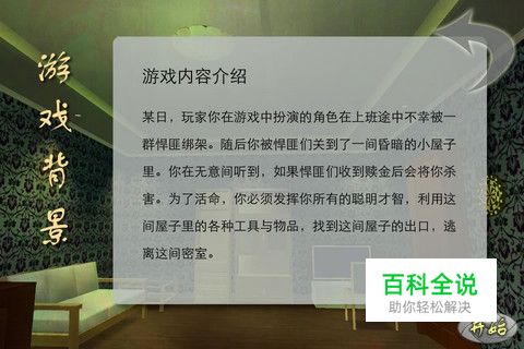 某日, 玩家你在游戏中扮演的角色在上班途中不幸被一群悍匪绑架。随后你被悍匪们关到了一间昏暗的小屋子里。你在无意间听到, 如果悍匪们收到赎金后会将你杀害。为了活命, 你必须发挥你所有的聪明才智, 利用这间屋子里的各种工具与物品, 找到这间屋子的出口, 逃离这间密室。
