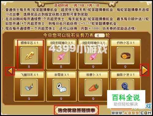 之后出现物品选择和活动介绍界面,我们可以通过左右三角形来进行上下页,选择物品,物品下面有个数字,代表你在10轮的比赛中要赢的次数,如辉煌圣石需要赢8次,选择好物品后,就可以进行答题猜拳了。