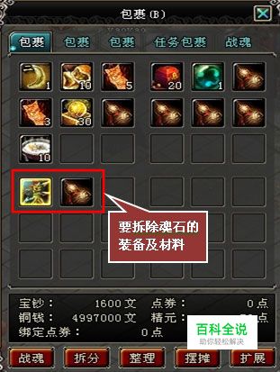 魂石拆除: 将已镶嵌了魂石的装备和散魂液放如自己的包裹中。