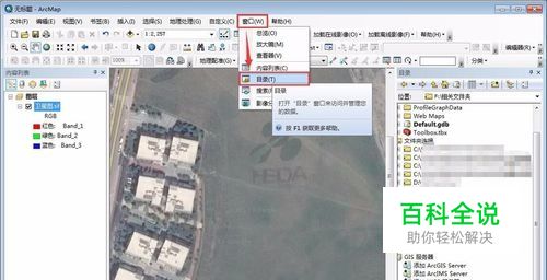 第二步:前期准备 导出完成后将导出的图片加载到ArcGIS内,在上面菜单栏上点击“窗口”→“目录”打开目录列表(图2)。在“目录”列表内 “文件夹连接”点击右键选择“连接到文件夹”(图3),连接到需要存放标注文件的文件夹。