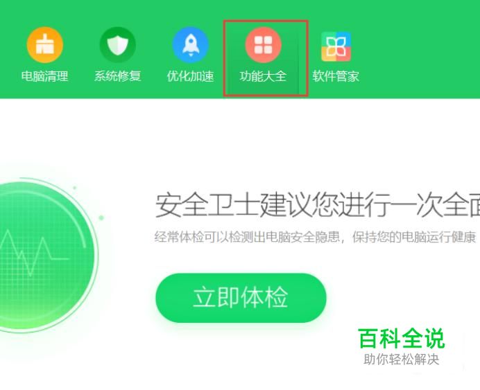 首先,打开360安全卫士主页面,点击页面顶部的“功能大全”菜单。