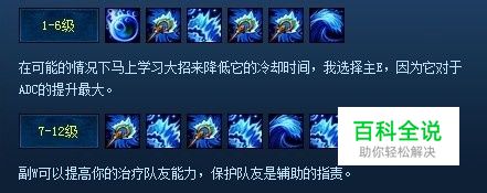 在可能的情况下马上学习大招来降低它的冷却时间,我选择主E,因为它对于ADC的提升最大。 7-12级 副W可以提高你的治疗队友能力,保护队友是辅助的指责。 13-18级 最后才升满Q。
