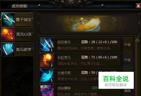开启化龙破技能后,同时伴随着其他技能的开启。凝剑术、暗八卦、棉剑术、破甲击。同时伴随着抵抗技能,好家伙,个个都是狠技能。一下子都很难抉择选择那个技能好。小编就建议你选不了,那我们就先不学。先学习墨子剑法中的长虹贯穿。这个技能是目前的最高的单体伤害,实在是PK中的好技能。当长虹贯日学的差不多,就差不多可以学习凝剑术了。长虹贯日和凝剑术这个两个攻击的距离是最远的,所以在战队中的可操作性比较强。限制比较少。