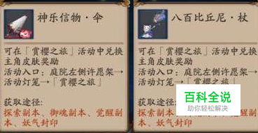 兑换需求:晴明:扇子*30+弓箭*20+伞*20+法杖*20 神乐:扇子*20+弓箭*20+伞*30+法杖*20 源博雅:扇子*20+弓箭*30+伞*20+法杖*20 八百比丘尼:扇子*20+弓箭*20+伞*20+法杖*30 兑换方式:灯笼架→活动→赏樱之旅