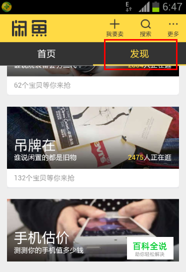 首先登录咸鱼然后看到选中的【发现】接着往下看到手机估价,如图所示