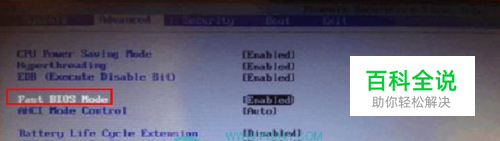 按下笔记本的电源键,开机不停的按“F2”键进BIOS操作界面,用方向键找到Advanced选项,选择“Advanced”标签,将“Fast BIOS Mode”的“Enabled”修改为“Disabled”,再进入“Boot“。