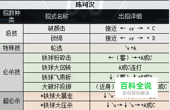 陈国汉,我们也称之为陈可汗,因为翻译的问题到了中国就是国汉了,我做了一份陈国汉的出招表,总和了陈国汉所有的技能和大招,大家可以看下。