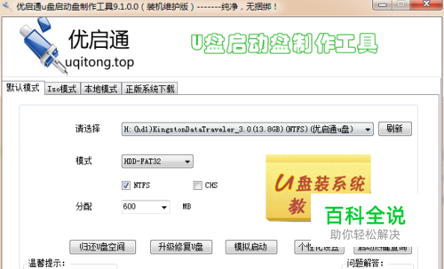 请选择-选择需要制作U盘启动的U盘 模式-通常选取HDD-FAT32 NTFS选项可选择性勾取,如果勾选,则U盘制作完成后自动转换为NTFS,可存取大于4GB的文件,如果不勾选,默认类型为FAT32,只能存取小于4GB的文件,这里建议勾选,因为部分系统ISO镜像大于4GB CHS不勾选 分配-600M即可 设置完毕后点击一键制作启动U盘