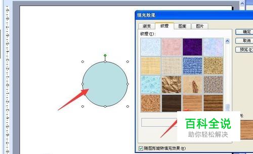 第一,先按住shift键,绘制出一个正圆,再设置正圆的填充效果为栎木纹理,如图。