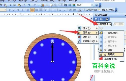 第五,把两个箭头选中,组合成一个整体,放到闹钟中间,如图,再右击箭头,设置自定义动画。