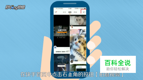 打开手机中的快手,在快手首页中点击右上角的按钮拍摄视频。