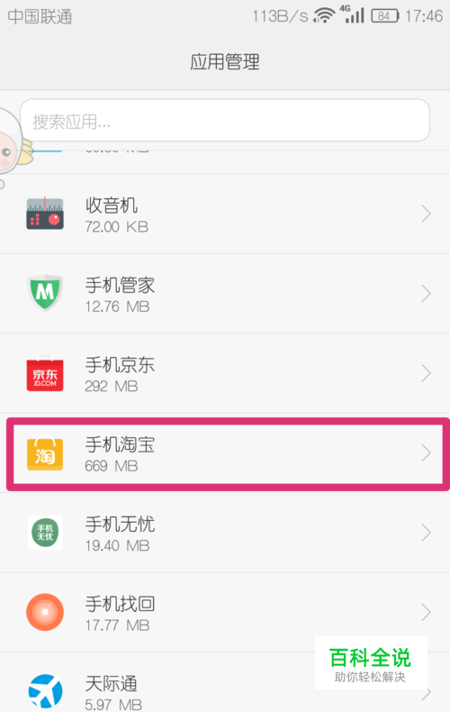 打开手机的“设置”界面,进入“应用管理”,找到我们需要清理的软件(手机淘宝),如图;(本教程以EMUI 4.0.3为例,但各版本操作大同小异)