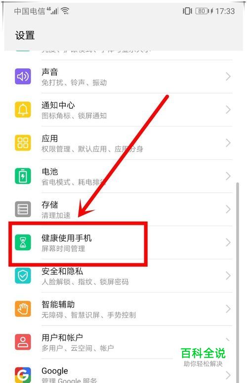 第二步,在打开的设置页面中,向下滑动页面,找到“健康使用手机”选项。