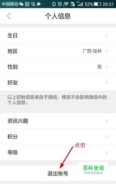 点击后,会出现如下图所示的个人信息页面,在这页面中点击页面下方的“退出账号”提示字体。就会进入下一步。