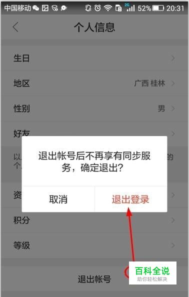 点击后,就会跳出如下图所示的弹出菜单。该菜单中有“退出登录”的提示字体。点一下那个红色的字就行了。