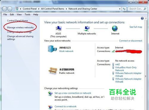 在电脑右下角的网络连接图标上右键 打开 网络和共享中心,在打开的窗口中选择 管理无线网络。