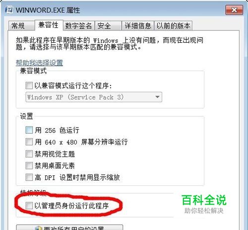 在WINWORD.EXE处点击右键--属性--兼容性--去掉“以管理员身份运行”选项钱的勾。