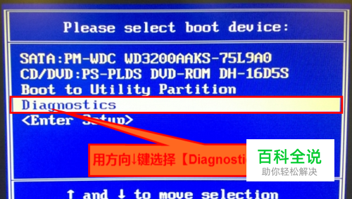 在出现下图所示的界面(提供新旧界面两张图片供参考)后,用方向下键选择【Diagnostics】,再按下回车键:
