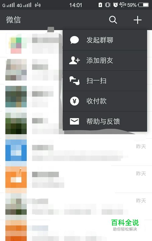 在右上角加号处,还有收付款功能,点击我要收款就是出现自己二维码来让别人扫。点击我要付款,同样需要别人来扫获取自己二维码信息。