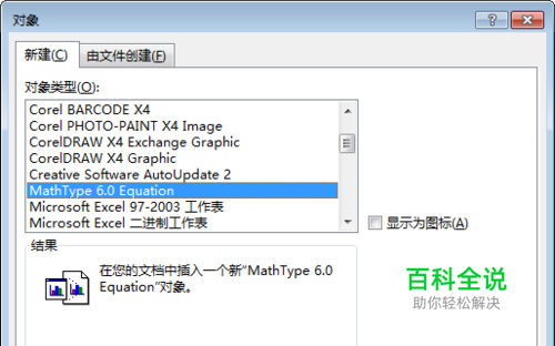 在弹出的对象对话框中,拖动下拉,找到MathType,选中并确定添加!