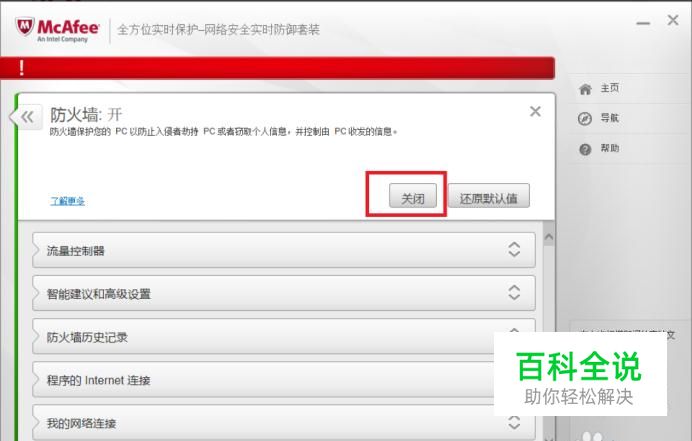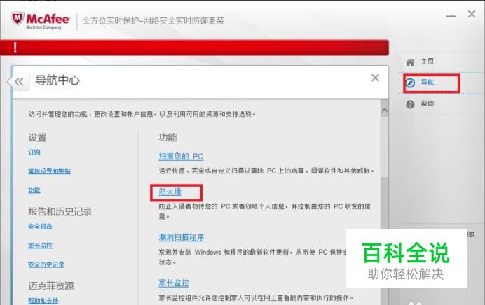 首先需要在电脑中打开迈克菲,找到导航,再找到导航中的防火墙;