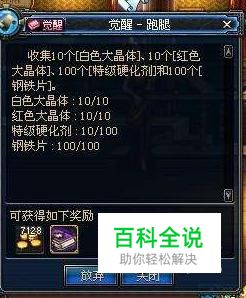 阿修罗觉醒找到指定NPC,完成第一项任务,材料收集:白色大晶体、红色大晶体、特级硬化剂、钢铁片,收集完成后,就能完成第一阶段任务;