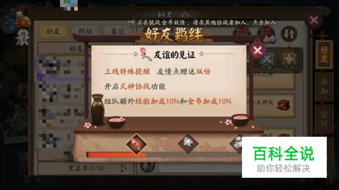然后在好友页面,可以看到右下方的协战页面,点击协战。可以在“+”号处设置自己的协站式神供亲友使用,亲友使用后可以累积一定协站次数,根据协站次数可以获得一定奖励。协助只有前50次可以获得奖励。奖励可以点击式神图片领取。