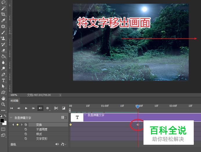 移动时间轴到后面,将文本移出画面外。 注:按空格键,可以快速预览动画。