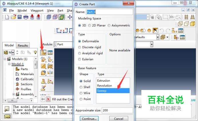 点击新建实体part的快捷图标,在弹出的菜单栏中可以给实体part命名,在type选项栏里选择sweep方法,即采用扫掠的方法来建立实体part。