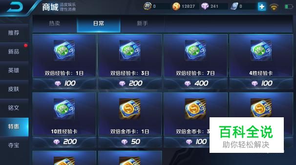 购买特惠商品: 在游戏中的商城→特惠页面,玩家可以通过钻石购买双倍经验卡,也可以通过钻石购买双倍金币卡。
