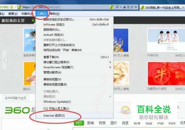Internet选项 点击IE浏览器工具栏中的【工具】,在弹出的下拉菜单中,选择【Internet选项】,如下图所示: