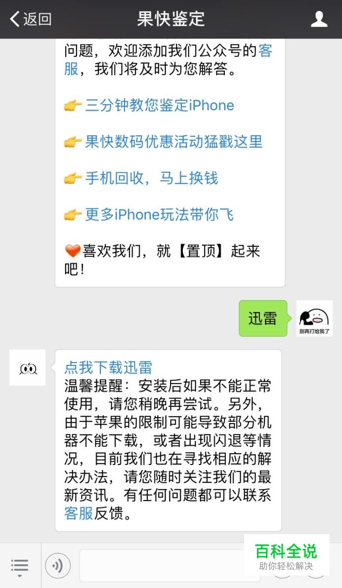 在公众号的对话框处回复“迅雷”,点击自动回复的“点我下载迅雷”。