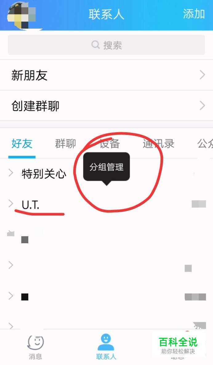 接着长按这个分组(比如这里的分组U.T.),长按后会出现分组管理这个选项。