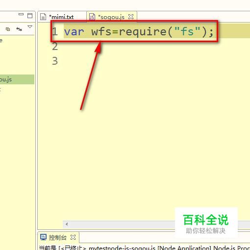 之后,开始在JS文件编写代码了。首先,在node.js中写入文件要用到fs模块,所以定义一个变量来保存引入的fs模块。