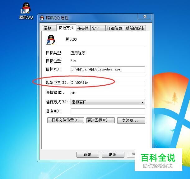 QQ安装位置 如果忘记QQ安装的位置的话,可以右击【QQ图标】,在弹出的下拉菜单中选择【属性】,然后在起始位置就可看到QQ的安装位置了,如下图所示: