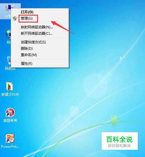 打开电脑之后,找到计算机快捷图标,在该图标上单击鼠标右键在弹出的右键菜单里找到管理选项,如图所示: