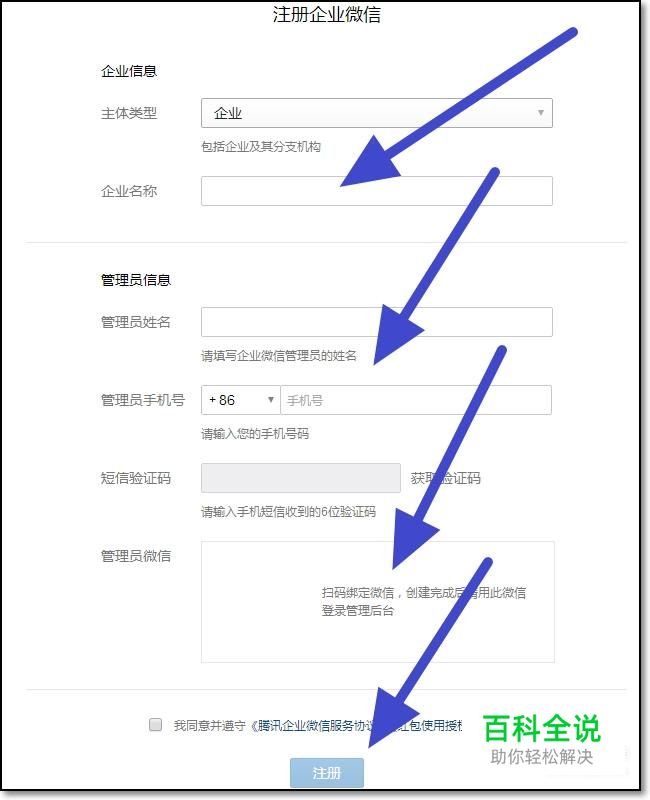 在注册企业微信界面,我们按照页面的提示信息,认真填写每一个选项,然后点击下方的注册按钮。