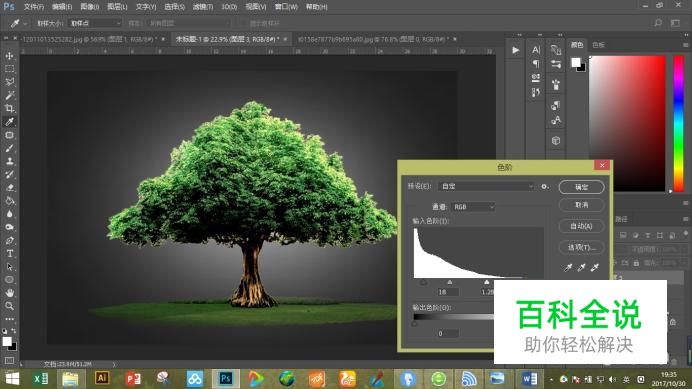 在图层顶部添加“大树”素材,对大树执行“色阶”命令(快捷键“Ctrl+L”)和“色相/饱和度”命令(快捷键“Ctrl+U”),增强对比度,把大树调成青蓝调,参数如下图所示,为大树添加蒙板,并在蒙板上擦掉一半的树叶部分,如下图所示: