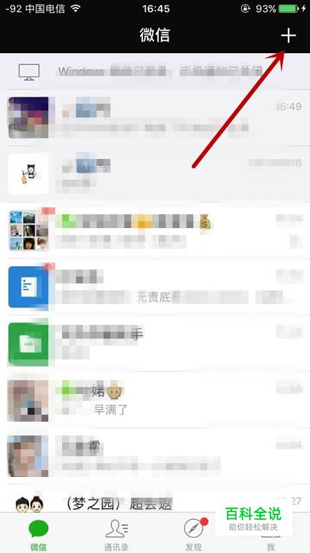 首先我们打开微信,点击右上角的“+”号选择添加朋友