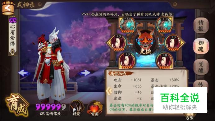 首先我们来看看SR式神狐妖的面板属性,狐妖的面板属性中攻击暴击和速度都是S,其中狐妖觉醒后基础速度为115,这是很多SSR式神都没有的属性,而生命和防御这两项就稍微差点只有B。单看面板属性狐妖可以媲美SSR式神