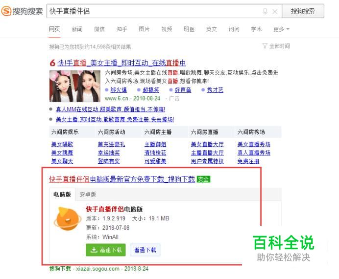 在搜狗浏览器搜索,快手直播伴侣,下载并安装。 或者直接进入官网点击PC端下载。