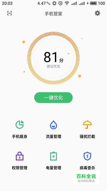 进入手机自带的“手机管家”界面,系统会自动开始体检一次,体检完之后我们点击“一键优化”