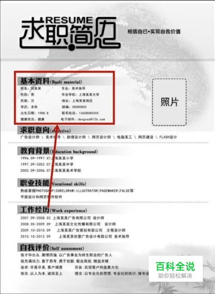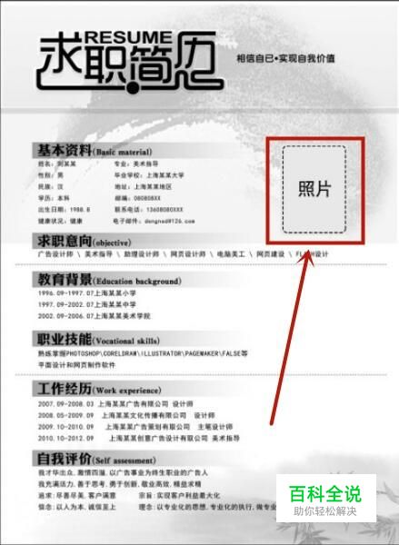 首先呢,你要准备一张照片(看起来精神一点的,着装清楚的,最好看起来非常的阳光正气的比较好。)然后把这张照片插入简历的右上角,如下图所示。