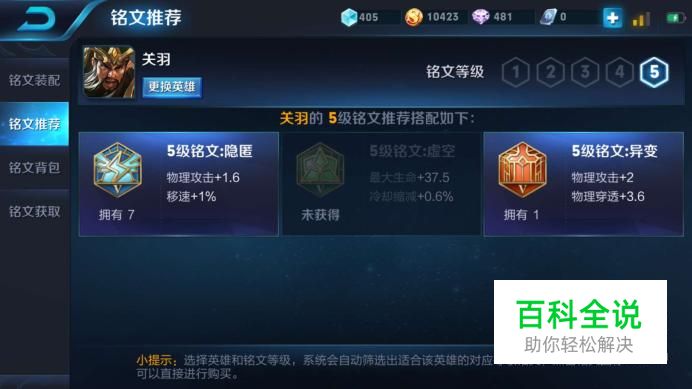 由于关羽是靠移动速度来刷新技能条的,所以蓝色铭文戴隐匿是最合适的,移速+1%,而绿色和红色铭文戴常规铭文就可以,如果是土豪的话,可以多开几个铭文页,专门为关羽做出一套铭文;