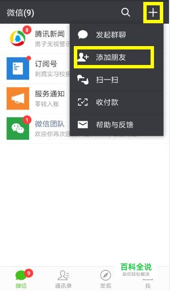 打开微信,点击右上方的加号,选择“添加朋友”。