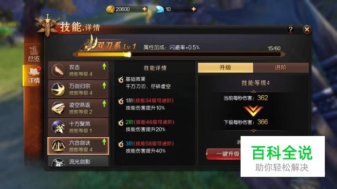 进入技能界面,在左侧列表中点选技能即可查看详情信息,点击“升级”即可进行升级操作。