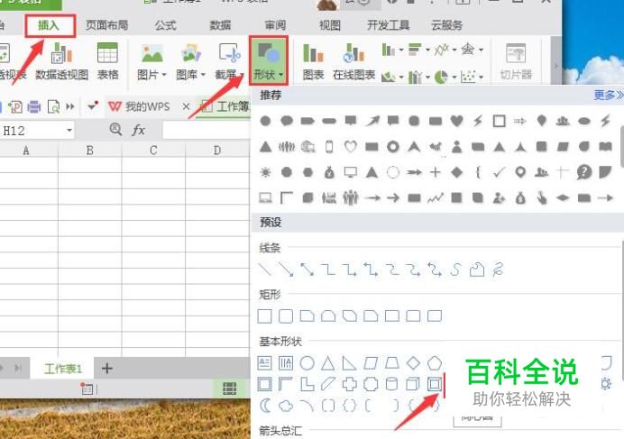 进入表格主界面后,在主菜单栏中选择“插入”工具,然后在其子菜单栏中选择“形状”选项,然后在弹出的各种图形样式中选择一个“同心圆”为例,如图所示: