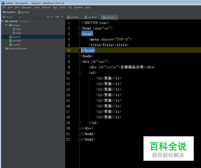 首先我们在<body>里面定义一个大的<div>标签,取一个ID名,在大的<div>标签里面再定义一个<div>标签和<ul>标签,在<li>标签里面输入,如图